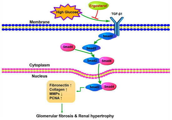 TGF-β is reported to be elevated under diabetic conditions and plays an important role in the initiation and progression of DN [37]. TGF-β/Smads signaling is thought to be over-activated during DN and plays a prominent role in the proliferation of mesangial cells and in the deposition of ECM, which are the typical characteristics in early DN [38,39]. TGF-β1 activates the receptor-regulated Smad2, which interacts with Smad4 and translocates to the nucleus to regulate target gene expression [40]. Data from our research show significant activation of the GF-β1/Smad2 pathway in STZ-induced mice and HG-induced mesangial cells. Smad7, as an endogenous inhibitory Smad, negatively regulates the recruitment and phosphorylation of Smad2 [41]. In the fibrotic kidney, the expression of Smad7 is prominently decreased. In addition, ergosterol treatment was shown to decrease the phosphorylation of Smad2 and the expression of Smad4 protein as well as improving the expression of Smad7. Besides, we used a TGF-β1 inhibitor to validate the TGF-β1/Smad2 signaling pathway involved in the inhibiting effect of ergosterol on mesangial cell proliferation and ECM expression. LY2109761 is a small molecule inhibitor against TGF-β1, which could inhibit Smad2 protein phosphorylation [42]. Interestingly, there is synergy between LY2109761 and ergosterol in suppressing high glucose-induced mesangial cell proliferation and ECM expression. These results suggest that ergosterol negatively regulated the TGF-β1/Smad2 pathway to control renal fibrosis in DN (Figure 9).