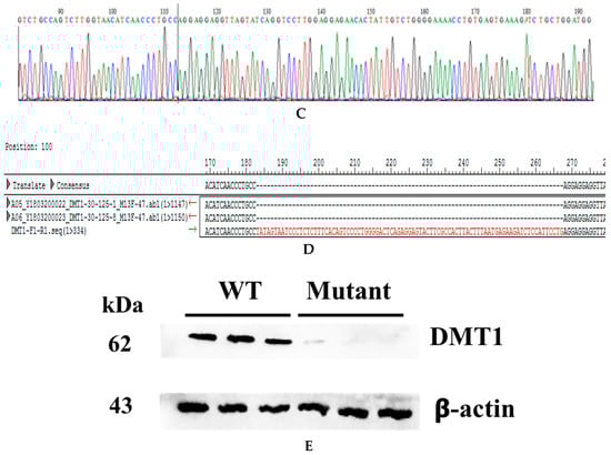 Figure 1. Validation of DMT1-knockout Caco-2 cell line. (A) The electrophoresis results of the target fragments of DMT1 in the transfected cells; (B) Partial sequencing results of the target fragment on DMT1 of wild-type Caco-2 cells; (C) Partial sequencing results of the target fragment on DMT1 of the mutant cells; (D) Sequence comparison of the target fragment of DMT1 in the mutant and wild-type Caco-2 cells; (E) Western blot results of DMT1 in wild-type Caco-2 cells and the mutant cells.