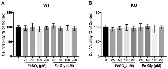 Figure 2. WT: wild-type Caco-2 cell; KO: DMT1-knockout Caco-2 cell. Cell viability of (A) wild-type and (B) DMT1-knockout Caco-2 cells after 2 h of iron treatment.
