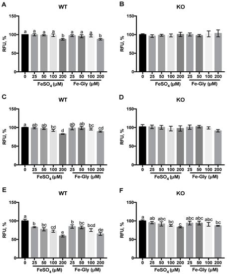 Figure 3. Changes of labile iron after treatment with different iron sources (0, 25, 50, 100, 200 μM) in wild-type cells and DMT1-knockout cells. Values not sharing a common letter differ significantly (p < 0.05). WT: wild-type Caco-2 cell; KO: DMT1-knockout Caco-2 cell; RFU: relative florescence unit. Changes of labile iron after 0.5 h (A,B), 1 h (C,D), 2 h (E,F) treatment with different iron sources in wild-type cells and DMT1-knockout cells.