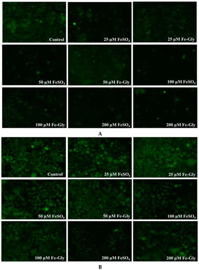 To visualize labile iron, cells on a 6-well plate were stained with Phen Green-SK and observed by a fluorescence microscopy. The cells were treated with gradient concentrations of iron for 2 h based on the results above. It can be seen from Figure 4A,B that low concentrations of Fe-Gly or FeSO4 result in the quenching of Phen Green SK in the wild-type cells, which indicates the increase of labile iron, while that in the knockout cells began to change after processing with higher concentrations of iron. The results of the live cell fluorescence imaging of labile iron confirmed the results we obtained by the fluorescence microplate reader.