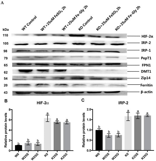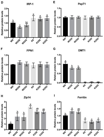 Figure 5. Expression of some iron regulators and transporters after treated with 25 μM of different iron sources for two hours. Values not sharing a common letter differ significantly (p < 0.05). W: wild-type cells treated with 0 μM iron; W25S, W25G: wild-type cells treated with 25 μM FeSO4, 25 μM Fe-Gly; K0: DMT1-knockout cells treated with 0 μM iron; K25S, K25G: W0: wild-type cells treated with 0 μM iron; W25S, W25G: wild-type cells treated with 25 μM FeSO4, 25 μM Fe-Gly; treated with 25 μM FeSO4, 25 μM Fe-Gly. (A) Western blot bands of iron regulators and transporters. Statistical analysis of (B) hypoxia-induced factor-2α (HIF-2α), (C) iron regulatory protein 1 (IRP-1), (D) IRP-2, (E) peptide transporter 1 (PepT1), (F) ferroportin 1 (FPN1), (G) DMT1, (H) iron-regulated transporter (IRT)-like protein 14 (Zip14), (I) ferritin expression.