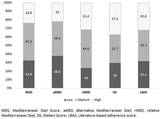 The mean scores of each of the indexes according their distribution by socio-demographic data is shown in Table 2. Figure 1 shows the distribution of the study population according to the level of adherence to a Mediterranean diet pattern for each one of the indexes. The relative frequency of subjects with a high level of adherence to a Mediterranean diet varied from 22% (95% CI 20.67–23.40) when using the aMED index to 37.2% (95% CI 35.67–38.83) with the DS index. Similarly, a high variability was observed for the prevalence of population with a low level of adherence to a Mediterranean diet, from 24% (95% CI 22.64–25.44) with the rMED index to 38.4% (95% CI 36.81–40.00) with the aMED index. Interestingly, it was only for the DS and LBAS indexes, scores independent of the study population, for which a similar distribution was observed—approximately one-third for each level of adherence. Confidence intervals for proportions to compare the categorical indexes are included in Supplementary Materials Table S2.