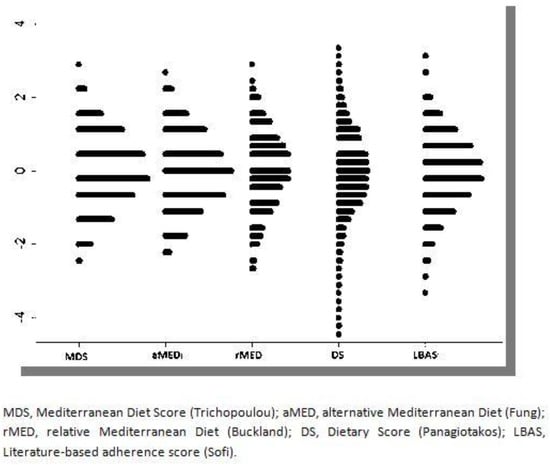 Dotplot representing standardised values of score according to each Mediterranean diet index (n = 3640).