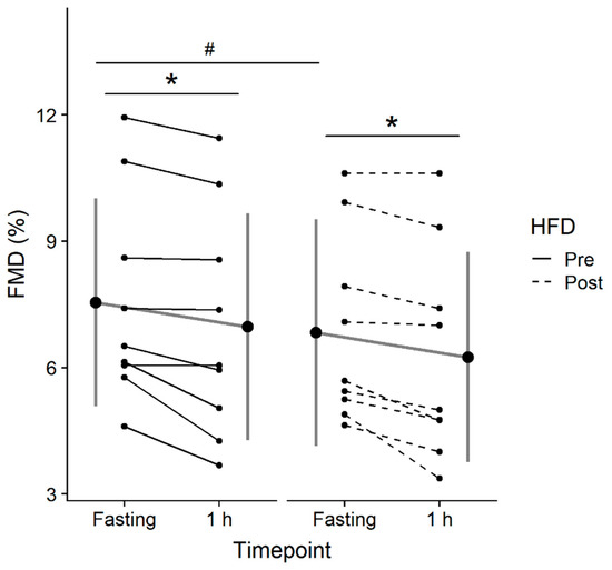 Flow-mediated dilation (FMD) assessed in the fasting state (Fasting) and 1-hour (1 h) following consumption of a 75-g glucose drink pre and post 7-day high fat diet (HFD). Data are expressed as the mean ± standard deviation (gray lines and large circles) and individually (solid and dashed black lines and small circles). Significant difference from Fasting to 1 h is denoted as * (p < 0.05), significant difference pre vs. post HFD is denoted as # (p < 0.05).