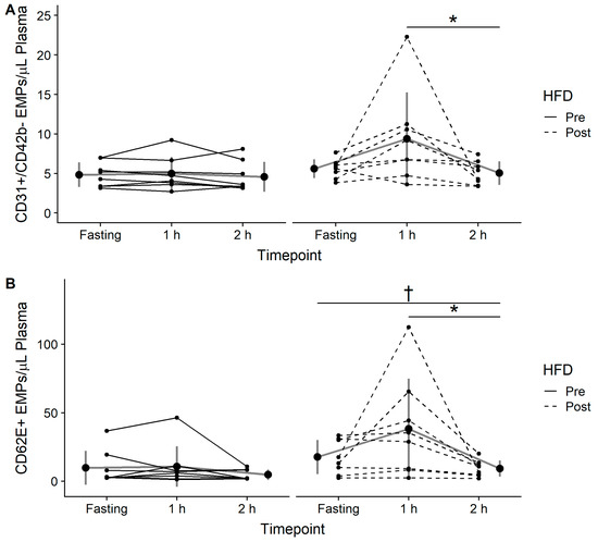 (A) CD31+/CD42b- endothelial microparticles (EMPs) and (B) CD62E+ EMPs assessed in the fasting state (Fasting), 1-hour (1 h), and 2-hours (2 h) following consumption of a 75-g glucose drink pre and post 7-day high-fat diet (HFD). Data are expressed as the mean ± standard deviation (gray lines and large circles) and individually (solid and dashed black lines and small circles). Significant difference from 1 h to 2 h post-HFD is denoted as * (p < 0.05), significant difference from fasting to 2 h post-HFD is denoted as † (p < 0.05).
