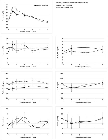 For each fasting state and postprandial biomarker outcome, we first screened for any sequence effects (order of test meal received) while controlling for diet, time postprandial and study visit 1 or 2 in the models. Since no meal sequence effects were observed, sequence was excluded from each model and data from both study visits were used. For data measured only during the fasting state (HMW Adiponectin, hs-CRP, Total-Cholesterol, LDL-cholesterol, HDL-cholesterol, lipoprotein particle size, HgbA1c), the models included diet and study visit. For the postprandial data, each model controlled for baseline values of the biomarker assessed. Furthermore, Tukey’s method of multiple comparisons was used to assess any differences between the dairy and nut meals at each time point. A separate model was used to explore the relationship between potential covariates (lipid profile, pre-pregnancy weight, pre-pregnancy BMI, gestational age, gestational weight gain, and measured body fat) with each of the measured outcomes at all time points in order to determine which covariates could be adjusted for in the model.