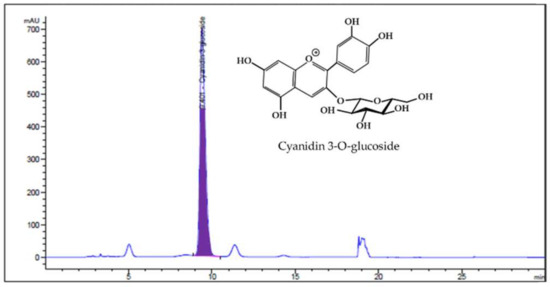 High-performance liquid chromatography with diode array detection (HPLC-DAD) analysis was conducted on Agilent 1100 DAD system. A C18 Kinetex column (4.5 mm × 25 cm, 5 μm) was used for the separation. The solvent flow rate and injection volume were kept as 1.2 mL/min and 10 µL, respectively, and the column temperature was fixed at 30 °C. The sample was eluted using mobile phase A (5% formic acid and water) and mobile phase B (5% formic acid and Acetonitrile) and was detected at 517 nm. The C3G, a major anthocyanin present in HBE, was detected by HPLC–DAD. The concentration of C3G in HBE was 5.91 mg/g with a 70% yield in a 25% ethanolic extract of honeyberry (Figure 1).