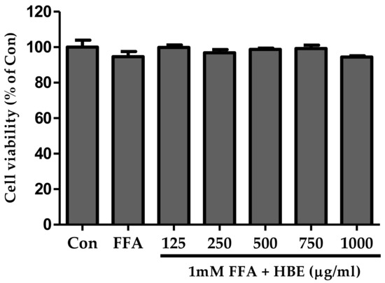 The CCK-8 assay was used to demonstrate the effects of various concentrations of HBE plus 1 mM FFA on cell viability. HBE treatment at a concentration of up to 1000 μg/mL with 1 mM FFA for 24 h did not demonstrate a significant decrease in cell viability (Figure 2).