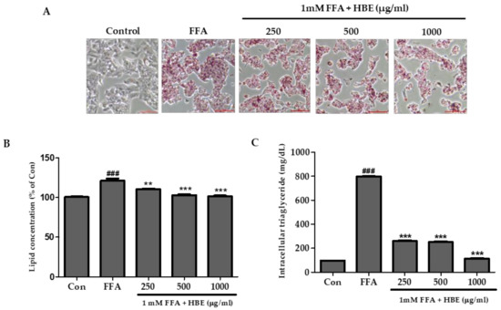 A significant increase in the lipid droplets was observed in 1 mM FFA-treatment group without added HBE compared with the control group (Figure 3A). However, at high concentrations (i.e., at 500 and 1000 μg/mL of HBE) along with 1 mM FFA treatment, the lipid droplets and lipid accumulation significantly decreased compared to the 1 mM FFA only group (Figure 3A,B). TG accumulation was induced by an exposure to 1 mM FFA treatment for 24 h. Intracellular TG content showed a significant decrease in the HBE treated HepG2 cells (Figure 3C).