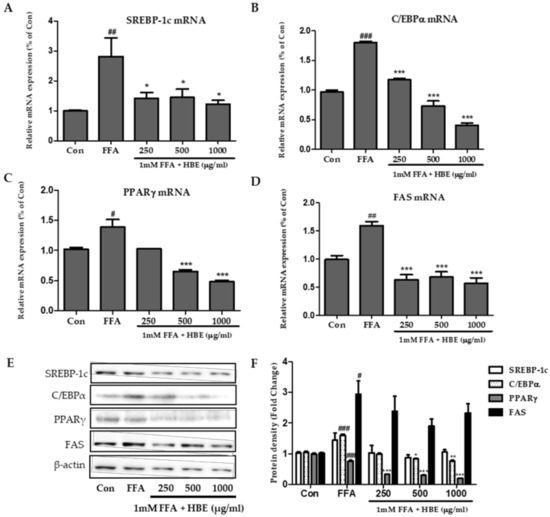 Effects of HBE on the expression of genes associated with lipogenesis in HepG2 cells. (A–D) The expressions of SREBP-1c (A), C/EBPα (B), PPARγ (C), and fatty acid synthase (FAS) (D) were quantified by real-time PCR and normalized by β-actin as an internal control. (E) SREBP-1c, C/EBPα, PPARγ, and FAS protein levels were monitored by Western blot analysis. (F) Protein density of SREBP-1c, C/EBPα, PPARγ, and FAS. Equal loading of protein was verified by probing β-actin. Data represent means ± SD. # p < 0.5, ## p < 0.01, ### p < 0.001 vs. Con; * p < 0.05, ** p < 0.01, *** p < 0.001 vs. free fatty acids (FFA).