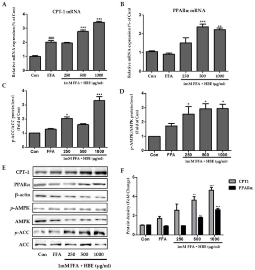 Effects of HBE on CPT1 and PPARα expression and AMPK, ACC signaling in FFA-treated HepG2 cells, with and without HBE supplementation. The mRNA expression of genes associated with fatty acid oxidation factors CPT1 (A) and PPARα (B) were quantified by real-time PCR and normalized by β-actin as an internal control. Western blot analysis of p-AMPK/AMPK (C) and p-ACC/ACC (D) in HepG2 cells. AMPK and ACC were used as a protein loading control of phosphorylated AMPK (p-AMPK) and phosphorylated ACC (p-ACC), respectively. (E) CPT-1, PPARα, phosphorylated AMPK and phosphorylated ACC proteins level by immunoblot analysis. The results from three independent experiments are expressed as the mean ± SD. (F) Protein density of CPT-1 and PPARα. Equal loading of protein was verified by probing β-actin. The results from three independent experiments are expressed as the mean ± SD. ### p < 0.001 vs. Con; ∗ p < 0.05, ** p < 0.01, *** p < 0.001 vs. FFA.