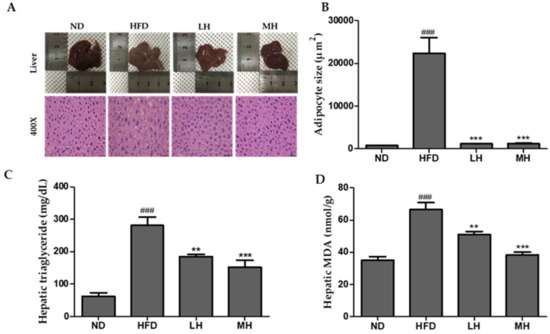 Effect of HBE treatment on hepatic steatosis in normal or HFD-fed mice. (A) Liver tissue histology (400×). (B) Adipocyte sizes of ND, HFD, LH, and MH. (C) The accumulation of liver TG. (D) Hepatic MDA levels. ND, normal diet control; HFD, high-fat diet; LH, HFD-supplemented 0.5% HBE; MH, HFD-supplemented 1% HBE. The results from three independent experiments are expressed as the mean ± SD. ### p < 0.001 vs. ND; ** p < 0.01, *** p < 0.001 vs. HFD.