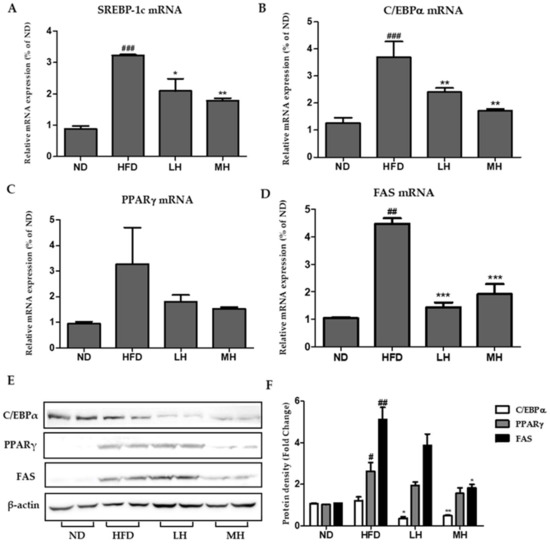 Effects of HBE on the expression of genes associated with lipogenesis in HFD-fed mice. (A–D) The expression of SREBP-1c (A), C/EBPα (B), PPARγ (C), and FAS (D) were quantified by real-time PCR and normalized by β-actin as an internal control. (E) C/EBPα, PPARγ, and FAS protein levels by Immunoblot analysis. (F) Protein density of C/EBPα, PPARγ, and FAS. Equal loading of protein was verified by probing β-actin. ND, normal diet control; HFD, high-fat diet; LH, HFD-supplemented 0.5% HBE; MH, HFD-supplemented 1% HBE. Data represent means ± SD. # p < 0.5, ## p < 0.01, ### p < 0.001 vs. ND; * p < 0.5, ** p < 0.01, *** p < 0.001 vs. HFD.