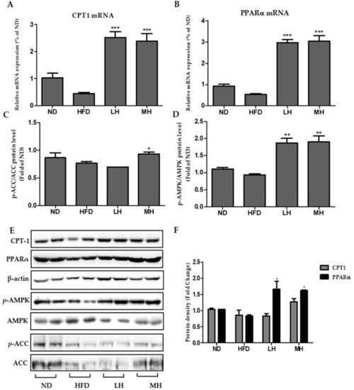 Compared to the HFD group, AMPK and ACC phosphorylation were increased in a dose-dependent manner in the HBE-supplemented (LH, 0.5% or MH, 1%) group (Figure 8C,D). In addition, HBE treatment up-regulated CPT-1 and PPARα gene and protein expressions in the supplemented HBE (LH, 0.5% or MH, 1%) group compared with the HFD group (Figure 8A,B,E). In immunoblotting analysis of CPT-1 and PPARα, dose-dependent elevations were observed in response to HBE treatments.