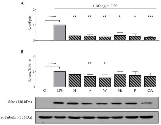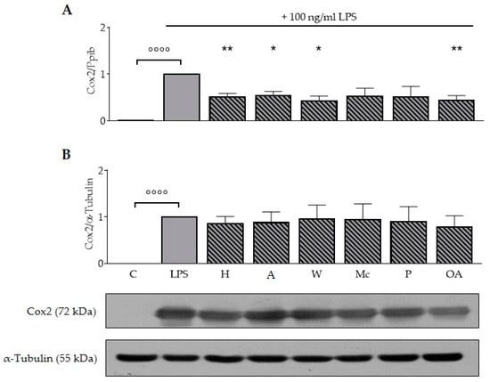 The data shown in Figure 2A demonstrate that LPS significantly induced expression of Cox2 mRNA (p < 0.0001) compared to the untreated control and the LPS-induced mRNA expression levels of Cox2 were reduced after treatment with ONEs of hazelnut (50%), almond (47%), walnut (59%), and OA (57%), respectively (p < 0.05; p < 0.01).