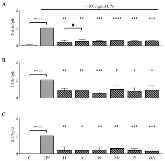 Oily nut extracts (ONE) and oleic acid (OA) strongly block LPS-induced Il1β, Il6, and Tnfα mRNA expression in RAW264.7 macrophages. RAW264.7 macrophages were incubated as described in Figure 1, and respective analysis and normalizations have been performed as mentioned before. (A) ONEs and OA significantly reduced LPS-induced expression of Tnfα. (B) Expression of Il1β was significantly reduced. (C) Expression of Il6 was significantly reduced. Error bars display calculated mean expression levels of 4 (A) to 5 (B,C) biological replicates. Abbreviations: A, almond; C, control; H, hazelnut; M, macadamia; OA, oleic acid; P, pistachio; W, walnut. Significant differences compared to the untreated control (°°°° p < 0.0001) and to the LPS control (* p < 0.05, ** p < 0.01, *** p < 0.001, **** p < 0.0001) were obtained by one-way ANOVA. # p < 0.05, represents significant differences between oily nut extracts.