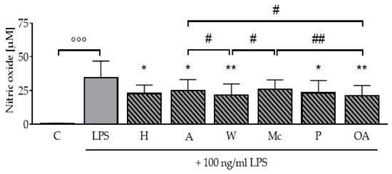 Oily nut extracts (ONE) and oleic acid (OA) decrease formation of nitric oxide in murine RAW264.7 macrophages. RAW264.7 macrophages were incubated as outlined in Figure 1 to perform Griess assays. The incubation with lipopolysaccharides (LPS) led to a significant increase in the production of nitric oxide to 34.7 µM. ONEs significantly reduced the LPS-induced production of nitric oxide. Error bars display calculated means of five independent biologically replicates performed as two technical replicates. Abbreviations: A, almond; C, control; H, hazelnut; M, macadamia; OA, oleic acid; P, pistachio; W, walnut; Significant differences compared to the untreated control (°°° p < 0.001) and to the LPS control (* p < 0.05, ** p < 0.01) were obtained by one-way ANOVA. # p < 0.05 and ## p < 0.01 represents significant differences between oily nut extracts.