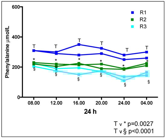 Regarding the comparison between regimens 1, 2 and 3 for median Phe concentrations for each time point (Table 3, Figure 2), there was a significant difference in median Phe at each time point (i.e., 08.00 h, 12.00 h, 16.00 h, 20.00 h, 24.00 h, and 04.00 h) between R1 vs. R2, [median value p = 0.0027] and R1 vs. R3 [p < 0.0001]. No significant difference was observed between any of the time points for R2 vs. R3. The Phe concentrations were consistently higher at all time points in R1 and lowest in R3.