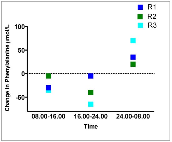 Regarding the comparison of the variation in Phe concentrations between regimens 1, 2 and 3 during each 8 hourly time period (08.00 h–16.00 h), (16.00 h to 24.00 h), (24.00 h to 08.00 h) (Table 4, Figure 3), measuring the Phe over 8 hourly time periods showed there was less variation with R1 and R2 compared with R3. In all three regimens, the largest change in blood Phe occurred overnight between 24.00 h and 08.00 h, R1: +35 μmol/L, R2: +20 μmol/L, R3: +70 μmol/L. The largest change in Phe at all three measured 8 hourly intervals was in R3. In all three regimens, Phe decreased between 08.00–16.00 h and from16.00 h-24.00 h, the least change was in R1, then R2 and the greatest change always in R3.