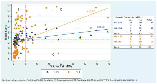 As a first step, we estimated the sensitivity and specificity of the indexes. We identified the “true positives” as those classified as having steatosis by the index (HSI ≥ 36 or FLI ≥ 30) and also as NAFLD by the MRI (>5% of triglyceride content in the hepatocytes). We identified “false positives” as those classified as having steatosis by the index (HSI ≥ 36 or FLI ≥ 30), but not with NAFLD by the MRI (≤5% of triglyceride content in the hepatocytes). We also estimated the Spearman correlation between each index score and the percentage of liver fat (by MRI).