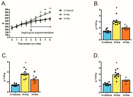 Body Weight (BW) during 8-weeks of amino acids or vehicle (water) supplementation via gavage started at 4-weeks (A), epididymal fat mass (B), retroperitoneal fat mass (C), and mesenteric fat mass (D). Rats that received chow diet and vehicle (C+Veh, n = 8), rats fed with a high fat diet and supplemented with Alanina (H+Ala, n = 10) and rats fed with a high-fat diet and supplemented with glutamine (H+Gln, n = 7). Values were displayed as mean ± SEM. Two-Way-ANOVA with a Bonferroni post-test was used in (A). One-Way-ANOVA with a Bonferroni post-test that was used in (B–D). * p < 0.05 vs. C+Veh and vs. H+Gln. # p < 0.05 vs. C+Veh.
