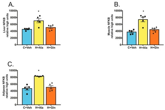 Nuclear factor kappa B (NF-κB) in the liver (A), muscle (B), and adipose tissue (C). Rats that received the chow diet and vehicle (C+Veh, n = 5), rats fed with a high-fat diet and supplemented with Alanina (H+Ala; n = 5), and rats fed with a high-fat diet and supplemented with glutamine (H+Gln, n = 5). Values were displayed as mean ± SEM. One-Way-ANOVA with the Bonferroni post-test was used. * p < 0.05 vs. C+Veh and H+Gln.