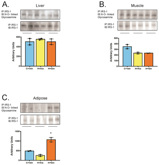 Insulin receptor substrate 1 (IRS1) association with N-O-linked glycosamine in the liver (A), muscle (B), and adipose tissue (C). Rats that received a chow diet and vehicle (C+Veh; n = 2), rats fed with high-fat diet and supplemented with Alanina (H+Ala; n = 2), and rats fed with a high-fat diet and supplemented with glutamine (H+Gln; n = 2). Values were displayed as mean ± SEM. One-Way-ANOVA with the Bonferroni post-test was used. * p < 0.05 vs. C+Veh and H+Ala.