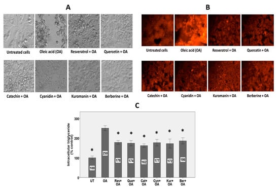 HepG2 cells were treated with OA (Sigma-Aldrich, Oakville, ON, Canada) and different polyphenols, as previously described [6]. Briefly, after growing HepG2 cells in 96-well plates for 24 h, the cells were treated with 10 µM polyphenol (resveratrol, quercetin, catechin, berberine (Sigma-Aldrich, Oakville, ON, Canada), cyanidin, or cyanidin-3-glucoside (kuromanin) (Extrasynthese, Genay Cedex, France)) for 2 h followed by 1.5 mM OA (dissolved in medium with 1% bovine serum albumin) for 24 h.