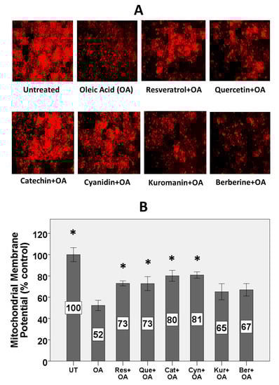 Effect of OA and polyphenols on mitochondrial membrane potential. HepG2 cells were treated with 10 µM polyphenols for 2 h followed by 1.5 mM OA for 24 h. (A) Fluorescence images representing the effect of OA and polyphenols on MMP after TMRE staining. Images at 20x magnification were captured using a ZOE Fluorescent Cell Imager. (B) MMP was measured following quantification of TMRE fluorescence using a microplate reader. Untreated cells were set at 100% and data are presented as % of the untreated cells. The Figure represents means ± SEM of three independent experiments with three wells of cells in each experiment. (*) Significantly different from the OA alone condition at p < 0.05.