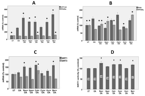 OA did not change sirtuin1 mRNA (SIRT1) expression, while catechin, berberine, and resveratrol (however not quercetin and anthocyanins) significantly induced SIRT1 mRNA by 46%, 44%, and 35%, respectively (Figure 3C).
