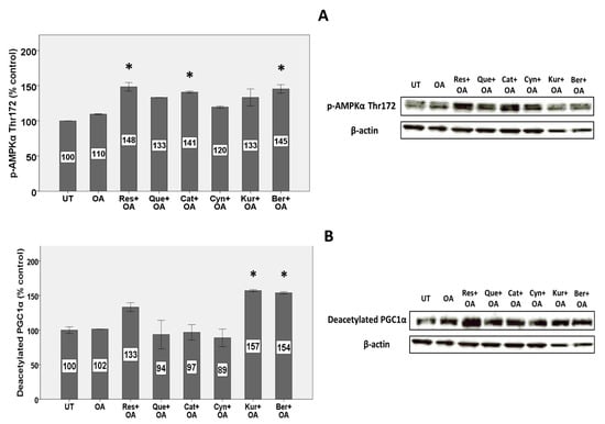 Treatment with OA did not change the phosphorylation of AMPKα on threonine 172 (p-AMPKαThr172), while some polyphenols such as resveratrol, berberine, and catechin induced the phosphorylation by 35, 32, and 28%, respectively (Figure 4A).