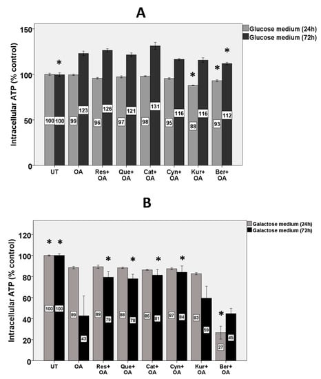 When the cells were grown in galactose medium for 24 h, OA slightly decreased intracellular ATP stores (by 11%) and polyphenols showed no protection (Figure 5B). Berberine worsened the effect of OA and together decreased ATP stores by 73% compared to untreated cells. In galactose medium, after 72 h, OA depleted intracellular ATP by 57%, while cyanidin, catechin, resveratrol, and quercetin inhibited the decrease by 95, 88, 84, and 81%, respectively (Figure 5B). Berberine and kuromanin did not protect against it.