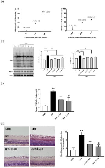 3.2. OSSCE Inhibits Nonenzymatic AGE Formation In Vitro, Expressions of Ages and RAGE in 25 mm Glucose-Treated HRMECs, and AGE Level in Serum and Whole Retina of SDT Rats