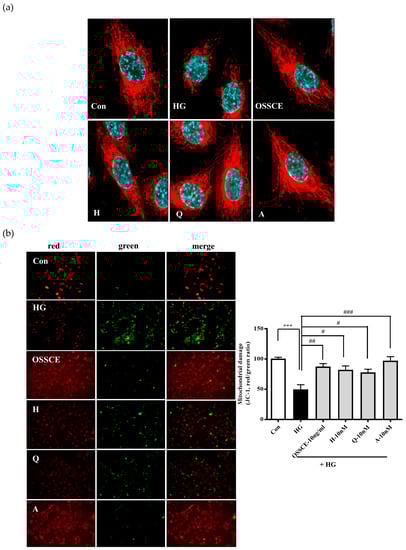 3.5. Protective Effects of OSSCE and MCs on HG-Induced Mitochondrial Morphology and Mitochondrial Membrane Potential (ΔΨM) in HRMECs