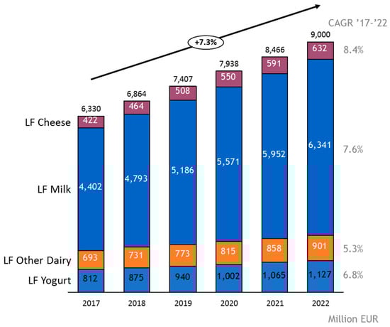 A compounded annual growth rate (CAGR) estimate of the lactose-free dairy market segment over the period 2017–2022. The total yearly turnover in M€ is indicated. LF: lactose-free. The figure was created from data of the Euromonitor analysis [6].