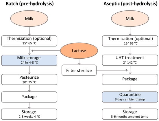 A schematic representation of the batch (left) and aseptic (right) processes that are used to produce lactose-free milk. The process conditions may vary from one factory to another, and additional process steps (like homogenization and standardization) are commonly included before the heat treatment. The batch process may include UHT treatment. The process step where lactose hydrolysis takes place is indicated in blue.