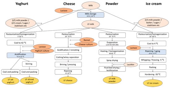 A flow scheme for the production of different lactose-free (LF) dairy products: The process conditions may vary from one factory to another, and additional process steps and additions are commonly included. All products can be made from LF-dairy ingredients, but yoghurt and ice cream may also be treated with lactase in the process. The process steps where lactose hydrolysis can take place are indicated in blue.