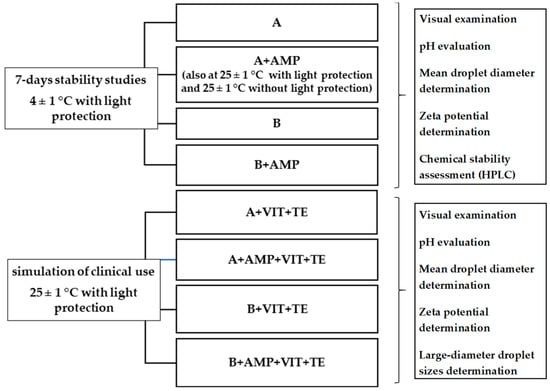Additionally, for the tested TPN admixtures (A, B, A + AMP, B + AMP) with vitamins and trace elements, the distribution of large-diameter droplet sizes assessment was performed in accordance with the requirements of the US Pharmacopoeia [11]. The measurements were taken immediately after the preparation of the samples and after 24 h. A routine gravity infusion set (Exadrop, B. Braun AG Melsungen) was used for sample collection, a procedure simulating the administration of TPN admixtures to hospital patients. All samples were stored at 25 ± 1 °C with light protection. A diagram of the study design is presented in Figure 1.