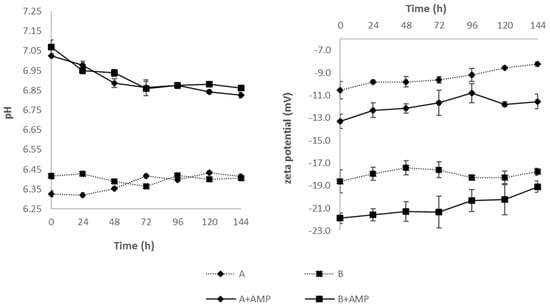Results of pH and zeta potential of TPN admixtures without (A, B) and with (A + AMP, B + AMP) ampicillin during storage at 4 ± 1 °C with light protection. Results are shown as the mean values of three samples ± SD.