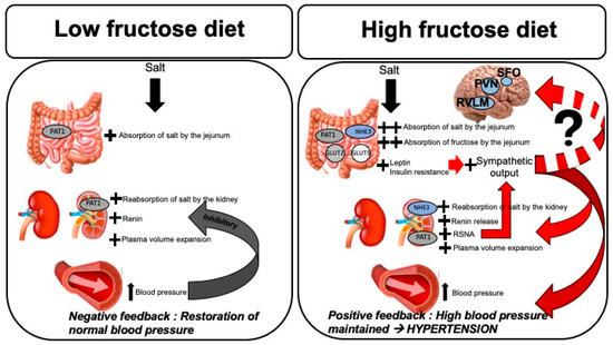 Mechanisms of fructose-induced salt-sensitive hypertension. Left panel: In the absence of high dietary fructose, absorption of salt in the small intestine (jejunum) and proximal tubule of the kidney is accomplished by PAT1. Increased sodium load leads to plasma volume expansion which activates RAS, resulting in elevation of blood pressure. Either increased plasma renin activity or increased blood pressure alone are capable of initiating the negative feedback mechanism to dampen NaCl reabsorption and decrease RAS activation, resulting in restoration of blood pressure back to normal. Right panel: When dietary fructose intake is high in conjunction with high salt, intestinal fructose absorption with Glut 5 and Glut 2 and sodium is absorption via PAT1 and NHE3 in increase. Proximal tubular sodium reabsorption is increased by both PAT1 and NHE3. Elevated fructose load leads to increased levels of circulating leptin and insulin, resulting in insulin resistance. These hormones lead to increased sympathetic outputs. In addition to activation of RAS and Na+ reabsorption, increased RSNA also participates in elevating blood pressure, ultimately resulting in the loss of the negative feedback mechanism. Increased afferent inputs to the central barosensitive regions may also contribute to hypertension by creating a feedforward situation via efferent sympathetic nerves. PAT1, putative anion transporter 1; NHE3, sodium/hydrogen exchanger 3; Glut 5 and Glut 2, glucose transporters 5 and 2, respectively; RAS, renin-angiotensin-aldosterone system; RSNA, renal sympathetic nerve activity; SFO, subfornical organ; PVN, paraventricular nucleus; RVLM, rostral ventrolateral medulla.