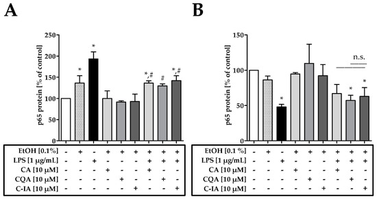 Figure 3A). Co-incubation of LPS with CADs led to a significantly lower p65 translocation compared to the LPS-challenged cells. However, p65 translocation into the nucleus was not reduced to control levels by the co-incubation of LPS with CA, CQA, and C-IA. CADs themselves did not modulate basal p65 translocation. The suppression of the nuclear translocation of p65 by treatment with C-IA was also confirmed via confocal microscopy (