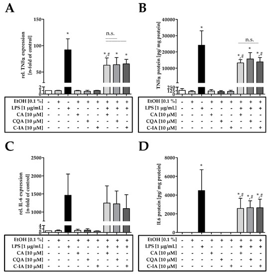 Figure 4C,D). Incubation with LPS led to a significantly higher expression of IL-6 mRNA compared to the control. Co-incubation of LPS with CA, CQA, and C-IA tended to lower the expression of IL-6 mRNA levels compared to LPS (