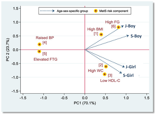 Two-dimensional biplot for risk components of adolescent metabolic syndrome (MetS) and gender-age-specific adolescent groups. Note: Red circles denote six adolescent MetS-associated risk components defined by the TPA-IDF generalized criteria. Arrows denote four gender-age-specific adolescent groups (J-Boy, junior boys; J-Girl, junior girls; S-Boy, senior boys; S-Girl, senior girls). The percentages indicate the amount of variance accounted for by principal components PC1 and PC2. Total explained variance from the first two components is 93.8%.