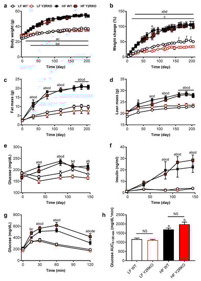 Body weight, body composition, fasting glucose and insulin and glucose tolerance of male wildtype (WT) and Y2R-deficient (Y2RKO) mice on either low-fat (10%; LF) or high-fat (60%; HF) diet. Absolute (a) and percent change (b) in body weight; total fat mass (c) and lean mass (d); fasting blood glucose (e) and plasma insulin (f) and intraperitoneal glucose tolerance test (1.5 g/kg) (g) with associated area under the curve analysis (h). n = 10/group. a p ≤ 0.05 LF WT vs. HF WT, b p ≤ 0.05 LF Y2RKO vs. HF Y2RKO, c p ≤ 0.05 HF WT vs. LF Y2RKO, d p ≤ 0.05 LF WT vs. HF Y2RKO, e p ≤ 0.05 HF WT vs. HF Y2RKO, f p ≤ 0.05 LF WT vs. LF Y2RKO.