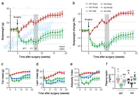 Effect of RYGB or sham surgery, or weight matching to RYGB by caloric restriction (WM) on body weight, body composition, and leptin levels of Y2RKO and WT mice. (a,b): Effect on absolute body weight and percent body weight change over the 18-week observation period. Body weight of WM mice was, by design, similar to RYGB and is not shown. Timing of glucose tolerance test (GTT), insulin tolerance test (ITT), and metabolic chamber exposure (M, gray bar) are shown in A. (c–e): Effect on fat mass (c), lean mass (d), and adiposity index (e) over the 18-week observation period. (f): Plasma leptin levels at termination of the study. Data in a-e are shown as means ± SEM. Data in f are presented as individual data points over a box showing means ± SEM. Groups that do not share the same letters are significantly different from each other (p < 0.05, pairwise t-tests with Benjamini–Hochberg correction, false discovery rate (FDR) = 0.05).