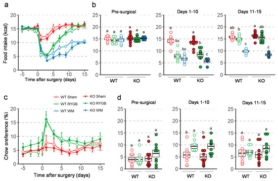 There were no differences in total energy intake between any groups before surgery (Figure 3a,b). After RYGB, food intake was significantly and similarly suppressed in both genotypes for the first 10 days compared to sham surgery and pre-surgical levels. In weight-matched mice, the amount of food necessary to maintain body weight of the respective RYGB groups was significantly less than food intake of RYGB mice for the first 15 days after surgery, and similar for the two genotypes. Preference for chow, which was very low before surgery, significantly increased during the first 10 days after surgery for both genotypes (Figure 3c,d).