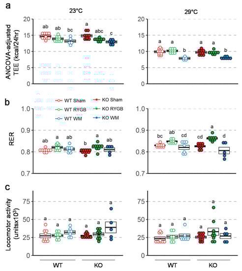 Effect of RYGB, sham surgery, or weight matching to RYGB by caloric restriction (WM) on ANCOVA adjusted energy expenditure using body weight as a covariate (a), respiratory exchange ratio (b), and locomotor activity (c) in Y2RKO and WT mice. Measurements were taken both at room temperature (23 °C) and at thermoneutrality (29 °C) at about 7–8 weeks after surgery. Data are expressed as individual data points over a box showing means ± SEM. Data that do not share the same letters are significantly different from each other (p < 0.05, pairwise t-tests with Benjamini–Hochberg correction, FDR = 0.05).
