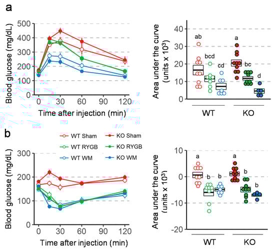 Effect of RYGB, sham surgery, or weight matching to RYGB by caloric restriction (WM) on glucose tolerance (a) and Insulin tolerance (b) in Y2RKO and WT mice. Data are presented as means ± SEM, or as individual data points over a box showing means ± SEM. Data that do not share the same letters are significantly different from each other (p < 0.05, pairwise t-tests with Benjamini–Hochberg correction, FDR = 0.05).