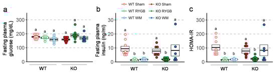 Effect of RYGB, sham surgery, or weight matching to RYGB by caloric restriction (WM) on fasting plasma glucose (a), fasting plasma insulin (b), and HOMA-IR (c), in Y2R-KO and WT mice, as measured at termination of the experiment. Data are presented as individual data points over a box showing means ± SEM. Data that do not share the same letters are significantly different from each other (p < 0.05, pairwise t-tests with Benjamini–Hochberg correction, FDR = 0.05).